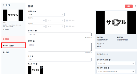 - ライブ詳細画面の左にある「ライブ操作」をクリックします。