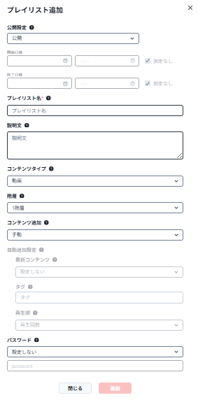 パスワード:プレイリストに対してパスワードを設定します。※プレイリストに設定されるパスワードはプレイリストに追加されている各コンテンツに設定されるのではなくプレイリスト自体に設定されます。また各コンテンツに設定されていたパスワードはプレイリストに追加することによって効力を失います。(プレイリストのパスワード設定が優先されます。)