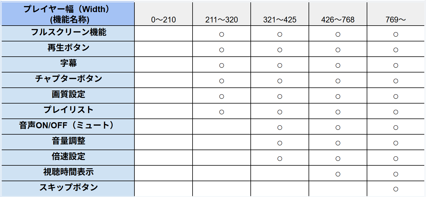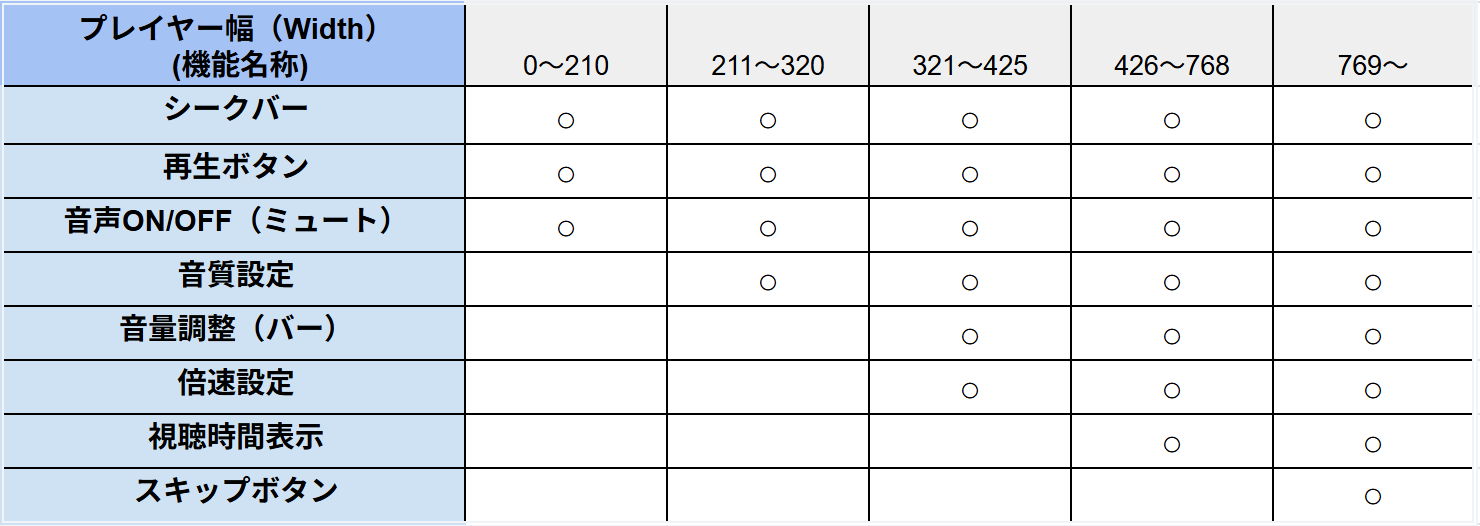 プレイヤー幅が769を下回った場合、一部機能(項目)が視聴者側から見えなくなります。