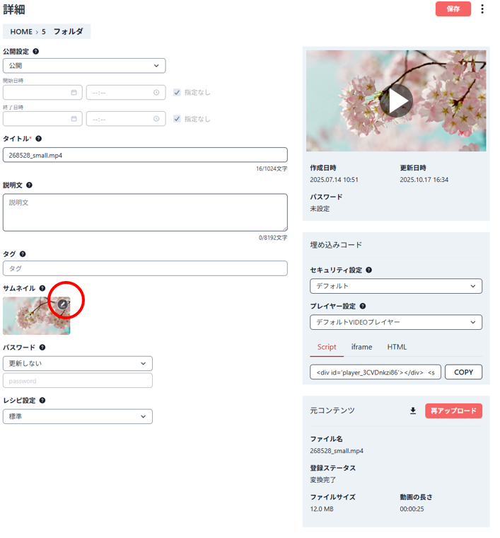 コンテンツをアップロード後、サムネイル設定画面を開きます。