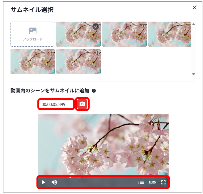 3.設定画面下部にある「動画内のシーンをサムネイルに追加」欄にサンプルプレイヤーが表示されます。